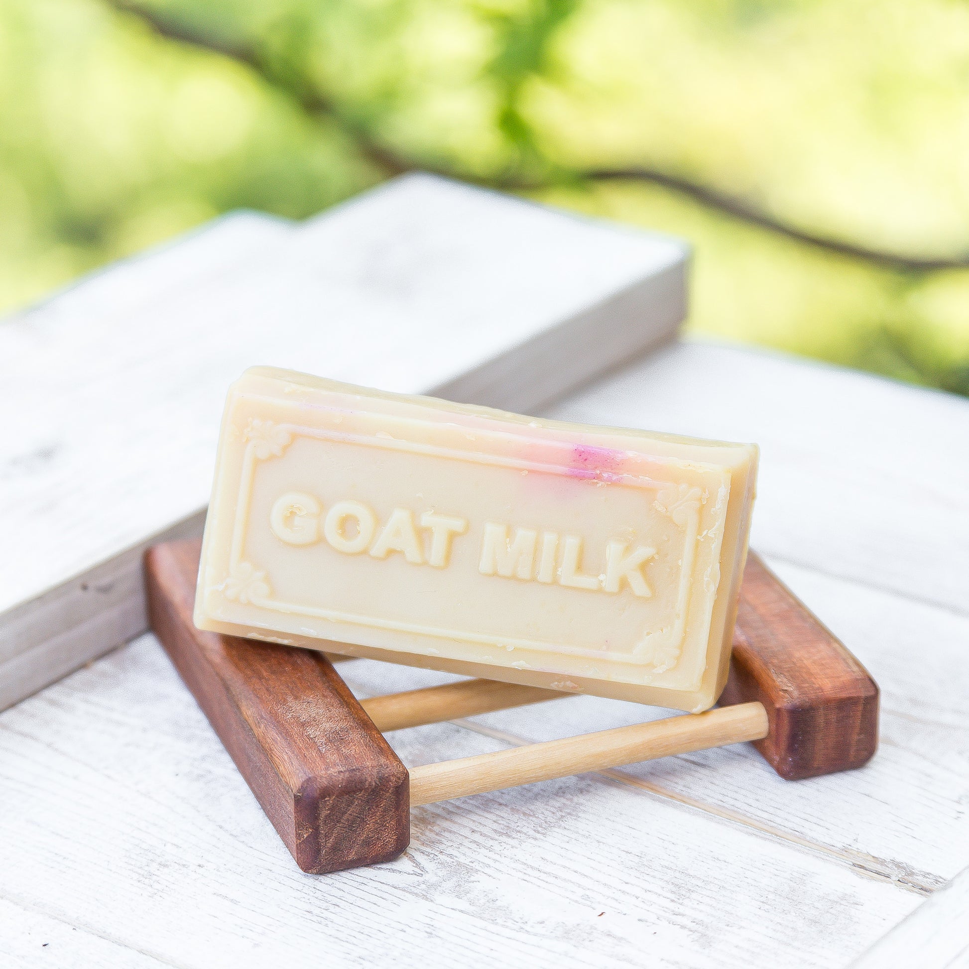 We make our homegrown goat milk, olive oil, coconut oil, caster oil, lye, fragrance oil, and natural oxide pigments.